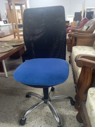 Silla de oficina con asiento azul y respaldo negro. - Base metálica con ruedas. - Respaldo de malla transpirable.