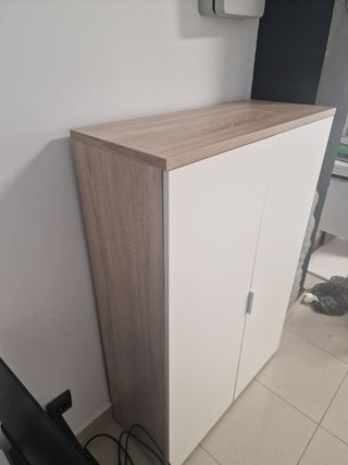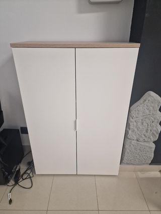 Mueble bajo con dos puertas y un diseño moderno que combina blanco y madera. - Acabado en blanco mate. - Tapa superior en imitación madera clara. Ha estado en una oficina, ha tenido poco uso y está en perfectas condiciones