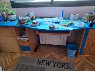 Escritorio de madera con un diseño clásico y funcional. - Patas torneadas en la parte delantera. - Cajonera lateral con 4cajones,le faltan 2 tiradores. - Necesita restaurar el color,pero la madera esta muy bien.