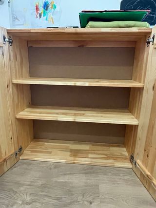 No es la de la foto, porque la tengo desmontada y queria mostrarla montada. Esa es mia. Asi que no tiene esos dos cancamos que se ven debajo. Estantería de madera de pino, con un diseño rústico y funcional. Ideal para organizar libros o elementos decorativos. - Estructura de madera. - Color pino natural. - Incluye un pequeño expositor para objetos pequeños.