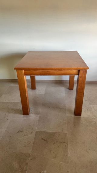 Mesa de comedor extensible fabricada en madera de pino. Su diseño es clásico y funcional. Es una mesa preciosa y de buenisima calidad. Perfecta para las celebraciones para toda la familia ya que se amplía muchísimo. Cerrada como se ve en la foto tiene las siguientes medidas: 90x160cm y 76cm de alto. Y si se abre minimo 60cm mas. Tambien las vendemos con las 4 sillas. Esta todo en muy buen estado, robusto y bien firme. Los únicos desperfectos son los desgastes tipicos por abajo en las patas de mesas y sillas. Pero apenas se aprecian ademas tebemos todo protegido. Con tapones en las patas y la mesa con hule.