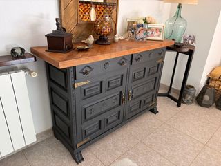 Mueble de madera estilo castellano restaurado con acabado en pintura a la tiza (chalk paint) de color grafito o gris oscuro. Bisagras originales. Acabado en superficie de madera de cerezo en forma de espiga. - 2 cajones de almacenamiento - 2 puertas. Con su llave original. - Repisas internas