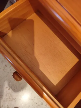 Mesita de noche de madera de pino con tres cajones. - Diseño clásico y funcional. - Tiradores redondos. - Acabado natural de la madera. MEDIDAS. 40cmX34cmX53cm ANCHO, FONDO, ALTO