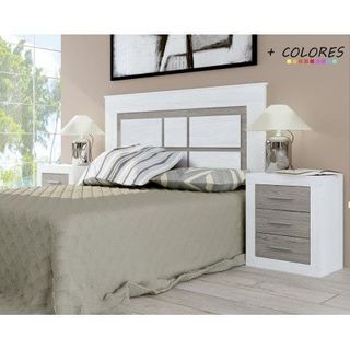 Conjunto de cabecero y dos mesillas de noche fabricadas en pino natural. Piezas con un diseño clásico y en buen estado. El cabecero mide: alto 113 cm y ancho 145 cm. La mesillas miden: ancho 49 cm, alto 63 cm y profundidad 35 cm. Todo en pino de madera natural. - Cabecero de madera con detalles curvos. - Dos mesillas con cajón y puerta. - Acabado en madera natural.