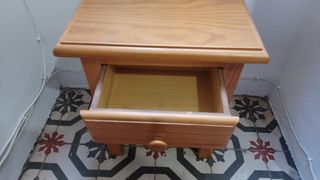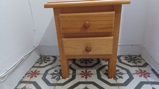 Se venden dos camas individuales de pino, cada una con su mesita de noche a juego. Incluye dos colchones y dos almohadas. - Material: Madera de pino. - Color: Tono natural de la madera. - Incluye: 2 camas, 2 mesitas de noche, 2 colchones y 2 almohadas.