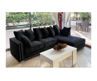 Lujoso sofa chaise longue Armazon de madera de pino Fabricado con muelles ensacados en asientos Cojines alta densidad como respaldo Tapizado en terciopelo negro intenso Remaches cromados en los reposabrazos y base Garantia dos años Envios contra reembolso 672*062*038