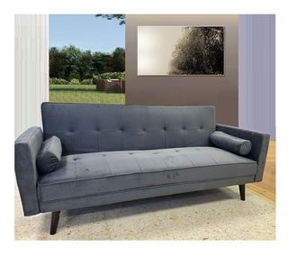 Sofá cama con sistema de apertura clic-clac reclinando el respaldo y transformandolo en una cama amplia Incluye dos cojines cilindricos Estructura y patas de madera de pino Tapizado disponibles : gris oscuro terciopelo Medidas Sofa 200x83cm Medida cama 105x189cm Garantia dos años. Envios contra reembolso 672*062*038