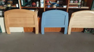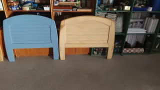 Se venden cabeceros de cama de pino macizo. Pintados en azul y en su color natural de madera. Sin estrenar. 100 cm. - Material: Madera de pino macizo. - Color: Azul y madera natural. - Diseño: Curvado con detalles.