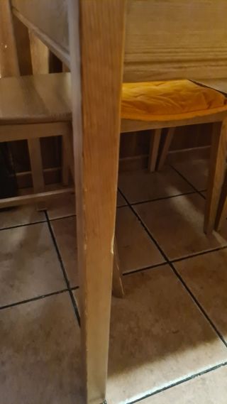 Tres sillas de madera de pino, color miel, en buen estado pero con marcas propias del uso. Una de ellas tiene unas marcas de quemaduras cómo se ve en la última foto. Por mudanza sólo estarán disponibles unos días. !!! El precio es por las tres unidades. Se vende el lote completo.