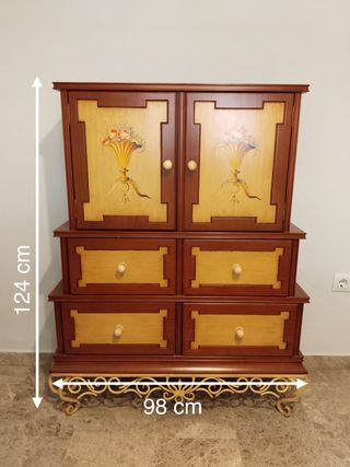 Mueble auxiliar de madera de pino con un diseño clásico y funcional. - Dos cajones superiores. - Dos puertas inferiores con tiradores redondos. - Acabado en tono natural de la madera. - venta en persona