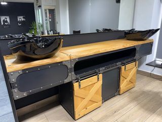Mueble de peluquería con estructura de hierro y madera de pino maciza. Cuenta con módulos con lava cabezas y grifería con desagües incluidas. SON TOTALMENTE DESMONTABLES LOS MÓDULOS DE LOS LAVACABEZAS. Se quedaría como el mueble que tengo subido compañero. - Diseño industrial único y realizado a mano todo. - Combinación de hierro y madera maciza con los detalles frontales de la corteza del árbol. -Puertas correderas y guías hechas con torno y a mano. •Medidas del mueble sin módulos del lavacabezas ( 141 ancho x 55 profundidad x 88 altura)