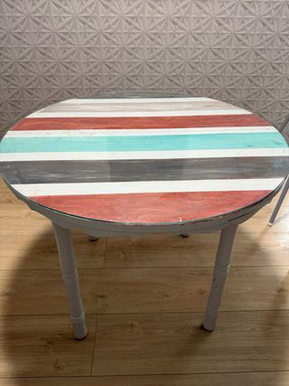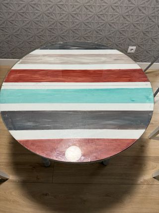Mesa redonda restaurada con un diseño único y colorido. La superficie de cristal protege el diseño. - Tablero con diseño de rayas multicolor. - Patas blancas con detalle. - Cristal protector en la superficie. -90 cm cerrada/148cm extendida