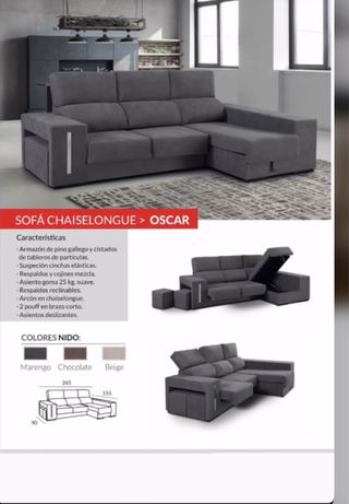 Sofá Chaise Longue Oscar de tela, en varios colores ! nuevos a estrenar - Estructura de madera de pino gallego. - Suspensión con cinchas elásticas. - Asiento de goma suave (25 kg). - Respaldos reclinables. - Incluye arcón en la chaise longue. - 2 pufs en el brazo corto. - Asientos deslizantes.
