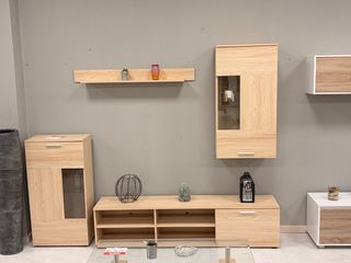 Conjunto de muebles de salón en acabado de madera clara. Incluye varios módulos para almacenamiento y exposición. - Mueble bajo de televisión con compartimentos. - Mueble alto vitrina con puerta de cristal. - Estante de pared. - Mueble auxiliar con cajón y vitrina. - Nuevo de paquete - Envio a contrareembolso