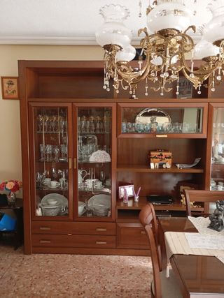 Conjunto de muebles de salón en tonos madera, ideal para organizar tu espacio. - Mueble con vitrinas de cristal. - Mueble de televisión con cajones y puertas. - Estanterías abiertas de 3 y 4 baldas - Aparador 5 puertas y 3 cajones - 8 sillas tapizadas en color mostaza. Una silla un poco desencolada - Mesa extensible a 250cm - Balda de estante ( tiene un pequeño quemado de vela en una parte. - Lampara de techo Presenta algún arañazo. La mesa de la televisión esta un poco descolorida como se muestra en la foto adjuntada. Venta en persona. Se vende el conjunto completo no por partes. El comprador se hace cargo del transporte