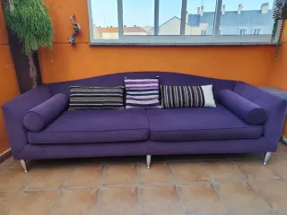 Sofá de salón en un llamativo color berenjena. Se encuentra en muy buen estado. - Tapicería de tela. - Diseño moderno con cojines. - Patas metálicas.