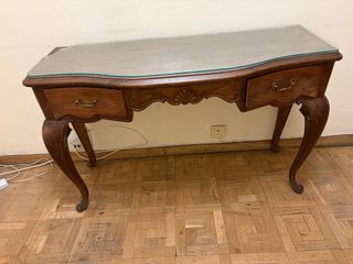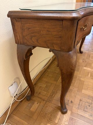 Elegante SECRETER de madera con un diseño clásico y detalles dorados. - Encimera de cristal. - Múltiples cajones para almacenamiento. - Patas curvas de madera.