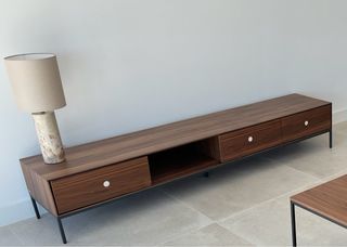 Mueble de TV Vedrana de Kave Home con diseño moderno y funcional. Ideal para tu salón. - Tres cajones para almacenamiento. - Acabado en chapa de nogal. - Patas de acero negro. - Medidas: 195 x 35 cm.