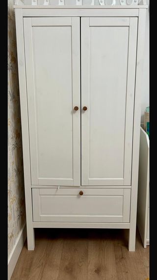 Armario de la serie Sundvik de Ikea. Un mueble de líneas sencillas y acabado en blanco que encaja en cualquier habitación. Ideal para habitación de bebe. Esta en perfecto estado y se tienen los tiradores originales - Tiradores redondos de madera. - Puertas con diseño clásico.