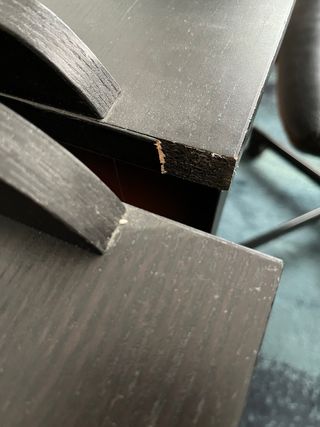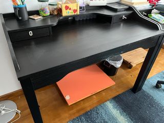 Escritorio de estilo moderno con dos cajones para almacenamiento. - Diseño funcional y elegante. - Acabado en color negro-marrón muy oscuro Algún pequeño desperfecto Cada uno 35€, 60€ los dos.