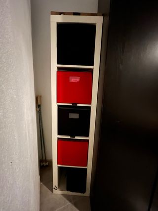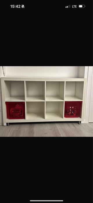 Mueble estantería Kallax en color blanco con dos módulos de cajones en rojo. los cajones se pueden quitar o poner en el hueco que quiera. se desmonta muy facil con llave allen - Diseño modular. - Dos cajones rojos con tiradores plateados. precio negociable