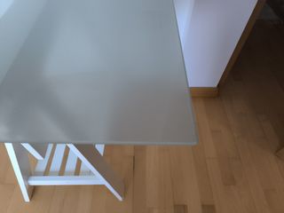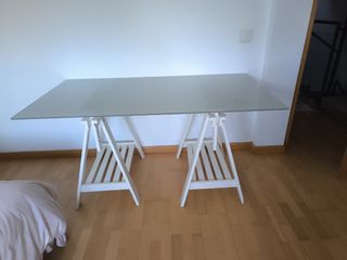 Escritorio elevable con tablero de cristal templado. Cristal en perfecto estado. Taburetes con algún desperfecto que no le quitan nada a la funcionalidad. Muy bonito. Tengo dos