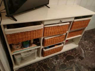 Mueble de almacenaje tipo aparador, con un diseño funcional y práctico. - Estructura principal de madera. - Cajón central con tirador. -Medidas Alto 80 Ancho 145 Profundidad 50 - Muchas capacidad de almacenaje - Marcas de uso pero le queda mucha vida