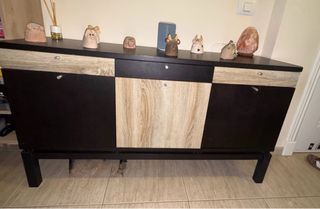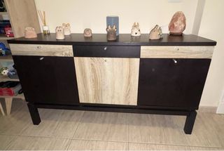 Aparador de Ikea, modelo Hauga en color gris oscuro. En perfecto esta salvo por unos desconchones de la pintura en un lateral (ver fotos). Están puestos unos pomos de adorno, pero conservamos los originales