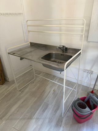 Mueble de lavadero de la serie SUNNERSTA de Ikea. Cuenta con una encimera y un fregadero integrados, además de una estructura superior para colgar. - Estructura metálica. - Encimera de acero inoxidable. - Fregadero de acero inoxidable.