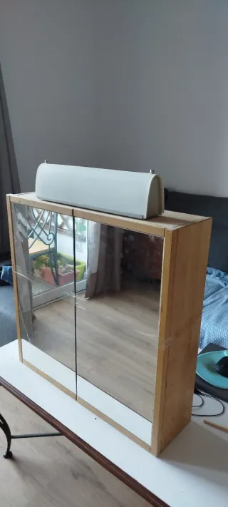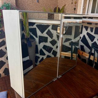 Mueble de baño con puertas de espejo. - Acabado en madera. - 2 puertas con superficie de espejo. -También espejo tras las puertas. -Medidas 60cm x 60cm sin contar la lámpara de arriba. -Lámpara de vidrio. -No recuerdo el nombre del modelo pero es de Ikea. No envío, recoger en La Cuesta, La Laguna.