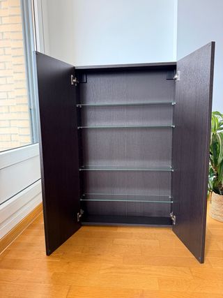 Armario auxiliar de baño de Ikea con un acabado en madera oscura. -Baldas de cristal regulables - Gran capacidad para organizar tu baño. -Muy buen estado excepto lo que se ve en la ultima foto.