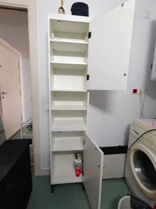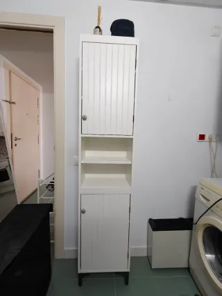 Armario de madera con detalles en blanco. - Diseño moderno. - Amplio espacio de almacenamiento. - Se puede usar para baño o dormitorio En Ikea lo ofrecen como mueble para baño y cuesta 155€ nuevo. Medidas: 1.80 altura, profundidad 33.5 y ancho 30 cm. Tiene un pequeño detalle en la puerta como se muestra en la foto, le puse un tornillo equivocado en la bisagra y tocó la madera adelante. Las bisagras funcionan perfectamente. También se puede usar horizontal. Se puede retirar por Sant Cugat. Lo puedo entregar armado o desarmado. Ayudo a cargarlo. Lo entregó perfectamente limpio.