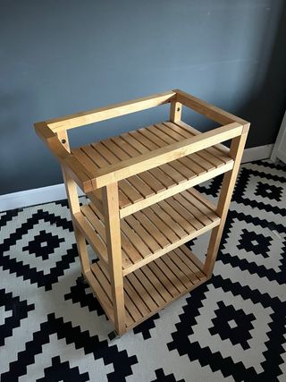 Vendo carrito auxiliar modelo RÅGRUND de IKEAfabricado en madera de bambúresistente a la humedad. Ideal para organizar el baño, la cocina o como mesa auxiliar. * Estado: Como nuevo, muy cuidado. * Características:3 niveles de almacenaje y ruedas para moverlo fácilmente. * Medidas:42x33x76 cm. Práctico, ligero y combina con cualquier decoración. ¡Listo para usar!