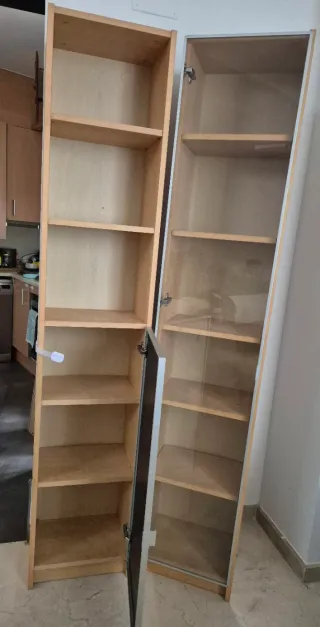 2 2stanterías altas de la serie Billy de Ikea, con un diseño versátil y funcional. - Estructura principal de madera. - Puertas de cristal. - Múltiples baldas para organización.
