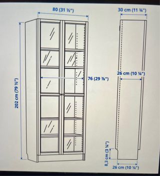 Mueble de almacenaje tipo librería de la serie Billy de Ikea. Sus puertas de cristal permiten ver el contenido. - Estructura principal de madera. - Puertas con paneles de cristal. Tiene una marca a mitad de la primera balda