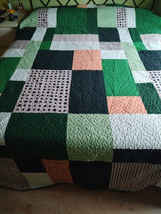 Colcha TALLSVÄRMARE de IKEA. Tiene un vistoso y colorido diseño de retales que recuerda a campos de cultivo vistos desde arriba. Está hecha de poliéster 100% reciclado. Está nueva, no se ha usado pero perdimos el ticket y por eso no pudimos devolverla.