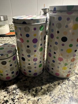 3 cajjas metalicas con for a redonda en tres tamaños, y estampado de lunares de colores. Puede valer para la cocina o para el uso que quieras... ⚠️Precio fijo⚠️