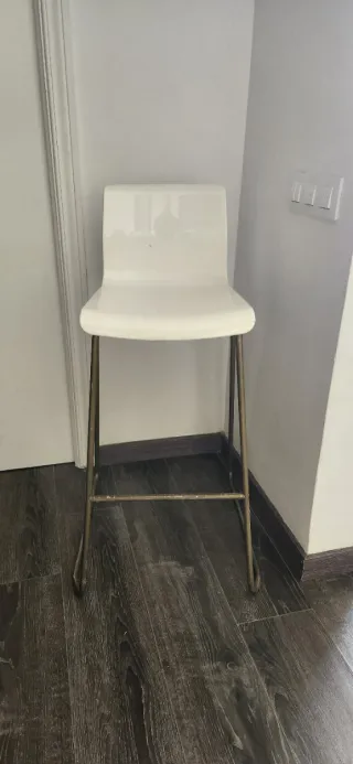 Silla alta cocina IKEA con reposapiés. Medidas Probado para: 100 kg Ancho: 50 cm Fondo: 48 cm Altura: 89 cm Ancho del asiento: 37 cm Fondo del asiento: 40 cm Altura del asiento: 66 cm - Asiento y respaldo de plástico blanco. - Patas de metal en acabado dorado.