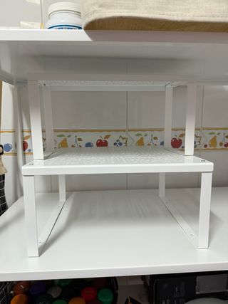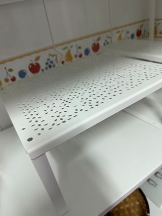 Mueble organizador de tres niveles con ruedas. - Estructura metálica. - Diseño moderno y funcional. Nuevo con etiqueta. Lo vendo porque al montarlo no me cabe en el hueco de la cocina e Ikea no me acepta la devolución por qué fue montado y los niños pintaron la caja (se aprecia en las últimas fotos). Nuevo 100%. No bajo precio.