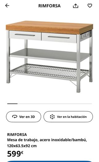 Mesa de trabajo o isla de cocina con superficie de bambú de máxima calidad y estructura de acero inoxidable. Muy fácil de limpiar. Muy resistente. Las baldas de metal tienen todavía pegatina antideslizante. Usada como almacenamiento de cosas de bebé. Venta por cambio de cocina. - Medidas: 120x63.5x92 cm.