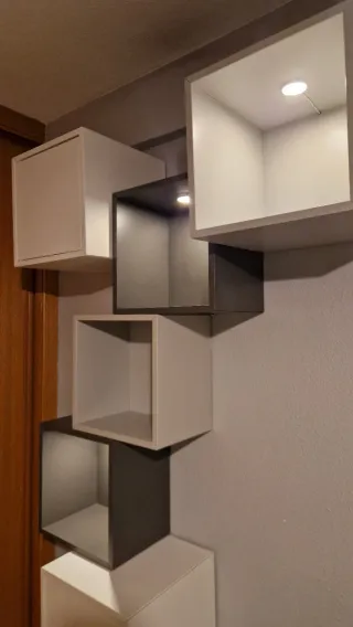 Conjunto de estanterías modulares Eket de Ikea, perfectas para organizar tu espacio. - Incluyen iluminación LED integrada. Vendo pack completo con juego de 3 luces y soportes de pared. Si te interesa alguno suelto, escríbeme.