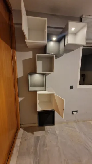 Conjunto de 7 cajas de pared Eket de Ikea, ideales para organizar tu salón. - Diseño modular y moderno. - Combinación de colores gris y blanco. Opcional: Mueble de la tele también en venta y la TV por 100€ más.