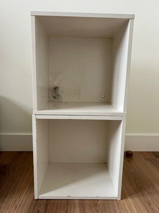 Se venden dos muebles de almacenaje EKET de IKEA. Son de color blanco y están fabricados en madera. - Diseño modular y versátil. - Ideales para organizar cualquier espacio. - Medidas 70x70x35 cada mueble - Uno de los muebles tiene un desperfecto ( Véase foto)