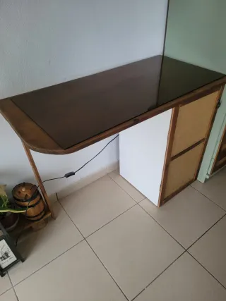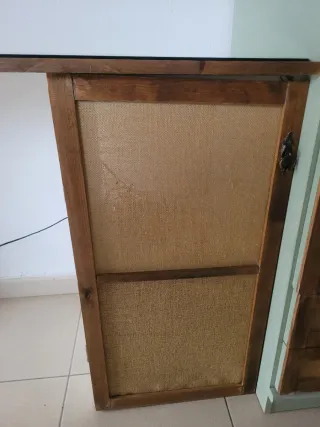La mesa es una estructura blanca de kallax con una puerta que le hice yo con tela arpilleria y listones de madera y una pata de madera anclada por abajo a una base de madera de pino. Todo lijado y teñido con aceite para madera. - Combinación de materiales que aportan calidez y sofisticación. - Pata de madera - Encimera de cristal oscuro obcional. Puedes elegir solo el kallax. La madera de arriba se quita y pone fácilmente. Medidas en las fotos. Recoger en Polop
