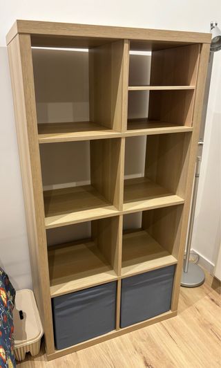 Estantería modular KALLAX de IKEA con acabado en color roble. Dispone de 8 cubos para almacenamiento. Se puede usar vertical u horizontal. - Acabado en color roble. - Incluye 2 cubos de tela azules y accesorio de balda intermedia (si no los quieres, -€5). Se recoge en persona en Carrer de Bartomeu Pi 15, Sants. Se entrega montada o desmontada(+€5)