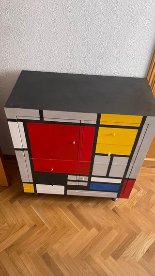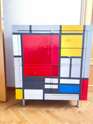 Estantería Kallax de Ikea con un diseño único inspirado en Mondrian. Sus dimensiones son 77x77 cm. - Diseño artístico y llamativo. - Acabado en madera.