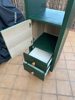 Estantería Kallax de Ikea de 3 compartimientos en color verde pintado a mano. Cada compartimiento mide 33,5 de altura/ ancho en la parte interna. Con patas incluidas. Tiene imperfecciones en una de las partes laterales y pinte por encima, como se ve en las fotos. - patas incluidas - Un compartimento con dos cajones. - Un compartimento con puerta