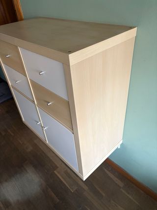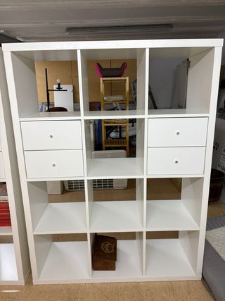 Mueble de almacenaje Kallax de Ikea, ideal para organizar cualquier espacio. Precio Ikea 149€ - Estructura de madera. - Cajonera blanca con dos cajones. Valorado en 20€