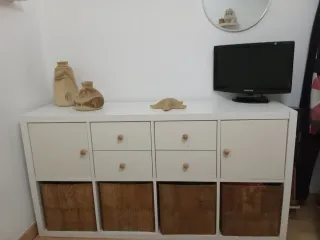 Vendo composición de TV IKEA KALLAX en color blanco, ideal para salón o sala de estar. Diseño moderno y funcional, con buena capacidad de almacenaje para libros, decoración, consolas o accesorios. 🔹 Color: Blanco 🔹 Medidas: 147 cm ancho × 77cm alto × 39 cm fondo -Mueble resistente y estable, fácil de desmontar para su transporte. Perfecto para espacios modernos y minimalistas. - Diseño modular con compartimentos abiertos y cerrados.