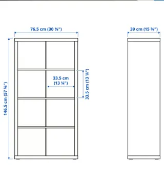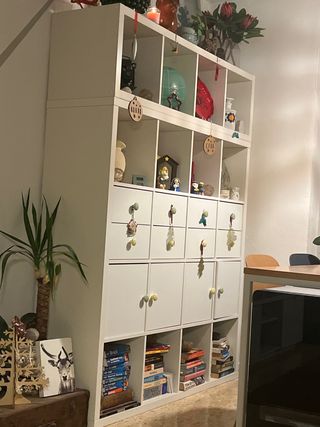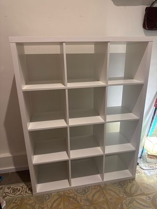 Estantería Kallax de Ikea con unas medidas de 147cm de alto por 79cm de ancho. Tiene alcún des onchón, la tenía con un tablero encima